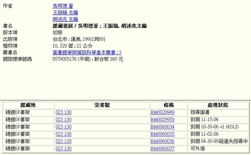 真是有點給他不爽,爲了館藏發展這門課,我借了吳明德的館藏發展這本書,圖書館六樓共有六本,其中好幾本被借走了,可是明明還有一本是「可外借」的狀態,偏偏就有人要來預約我這一本,害我的借期被縮短,怒!