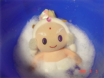 從高三那年還金金到家裡來,至今也近三個年頭了,並不是因為懶惰,而是為了種種替娃娃洗澡時的禁忌和複雜的手續,因此即使每次看到他因為我每日的把玩而漸漸黯淡、漸漸髒污,我也不敢替他洗澡,即使偶爾想到因為沒辦法讓他保持像剛來的時候那樣乾乾淨淨而著急地流淚,我也不敢讓他碰水。