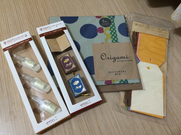 我選了四樣手作素材如下,由左至右分別是留言小貼-瓶中信(透明)、留言小貼-古典書、ORIGAMI玩色紙-牛皮紙系列、配件-20色吊牌小卡。